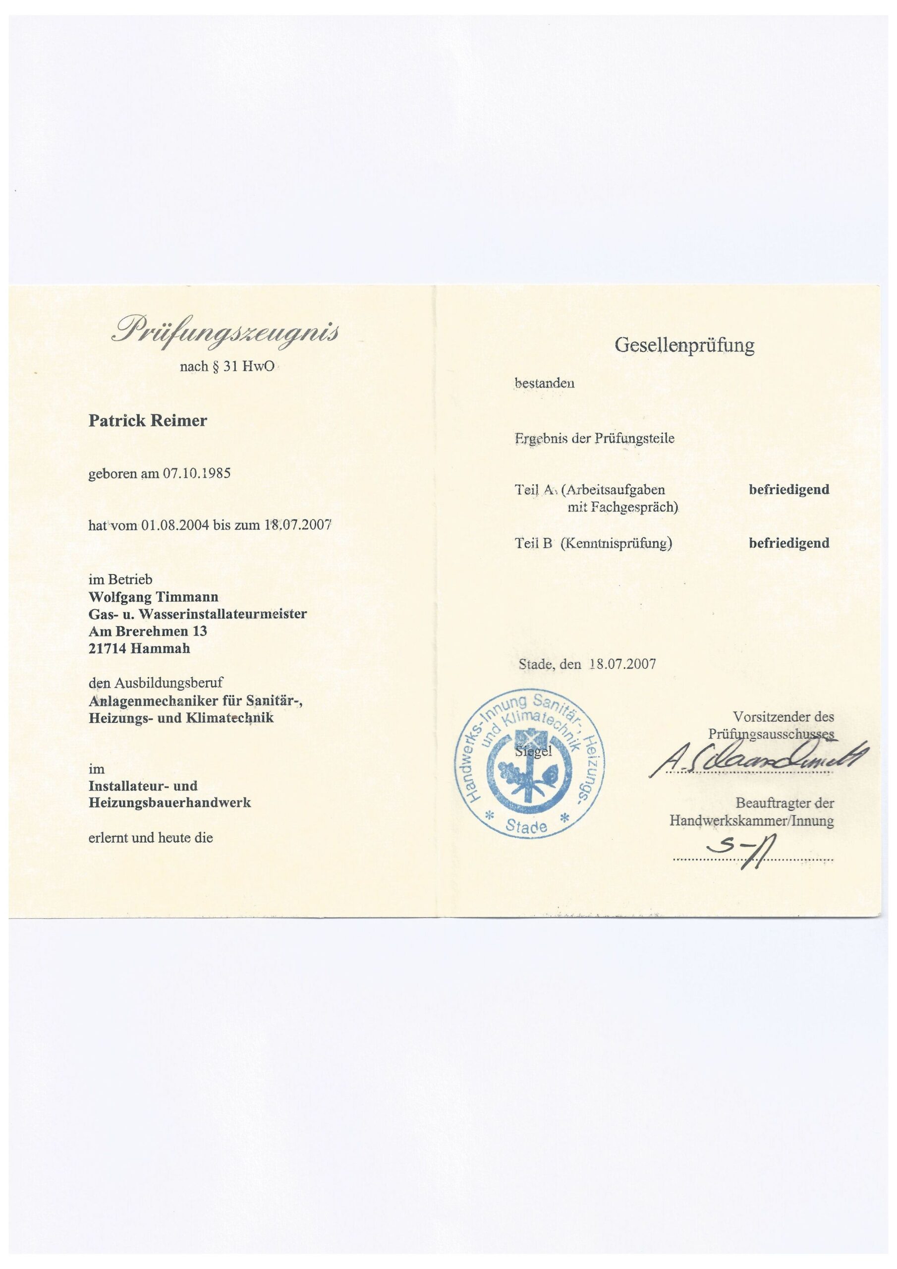 Meinen Gesellenbrief präsentiere ich hier mit Stolz – nicht als Relikt der Vergangenheit, sondern als das Fundament meiner heutigen Beratung. Wenn ich eine Immobilie für Sie bewerte oder vermittle, tue ich das mit dem geschulten Auge des Handwerkers und der Strategie des Maklers.